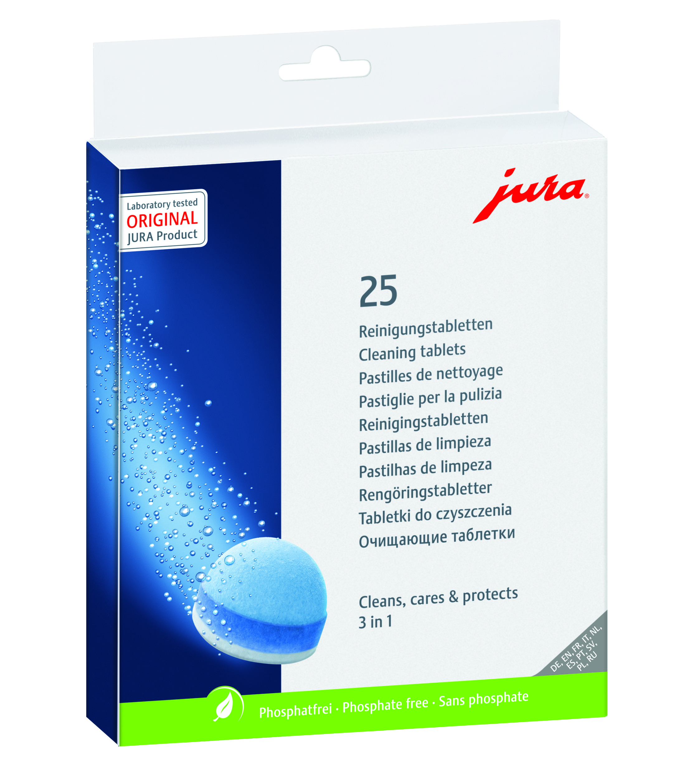 Oryginalne, sprawdzone miliony razy tabletki czyszczące firmy JURA są stale udoskonalane i rozwijane przez nasz zespół laboratoryjny. Nowa trójfazowa tabletka czyszcząca, będąca innowacyjnym rezultatem intensywnych badań, oferuje teraz jeszcze lepsze efekty czyszczenia dzięki dodatkowej fazie ochronnej, która zapewnia automatycznemu ekspresowi do kawy trwałą ochronę przed osadami z minerałów. Zastosowanie jest jak zwykle proste.