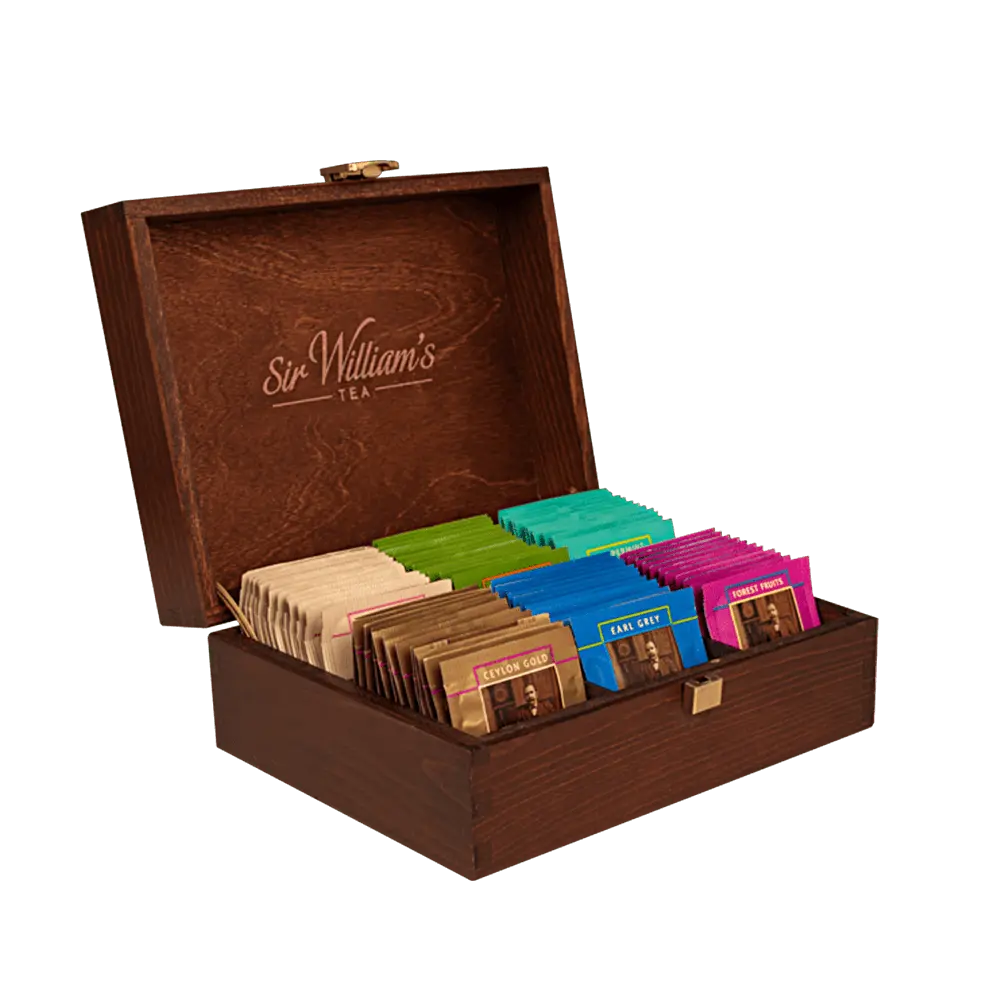 Drewniany prezenter zawiera 90 saszetek herbat w 6 smakach (6×15 saszetek): Ceylon Gold, Earl Grey, Green Sencha, Peppermint, Williams White oraz Forest Fruits.